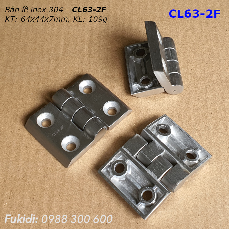 CL63-2F là bản lề inox 304 đúc nguyên khối, KT: 64x44, dày 7mm, tâm vít 40x25mm, dùng làm bản lề cho tủ điện, tủ thực phẩm công nghiệp hay tủ cần độ bềm chống gỉ sét, chống ăn mòn.